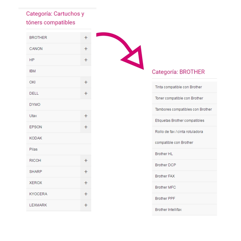 Cuando clicamos a cualquiera de estas tres opciones nos aparecerá un indice a la izquierda de la pantalla con las subsecciones de esta categoría. En el caso de Cartuchos y tóners compatibles, estas subcategorías aparecerán por marcas y si clicamos en alguna de ellas veremos las series de las impresoras.