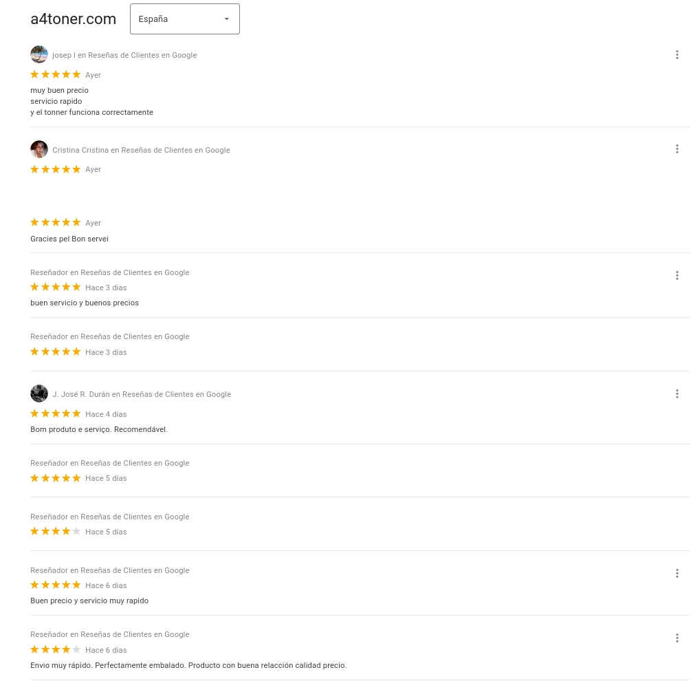 Compartimos los comentarios con vosotros, sobre todo para los que no nos conocen, para que a través de nuestros clientes, sepáis un poco más de A4toner, de nuestro producto, de nuestra atención comercial, y de nuestras ganas de mejorar con cada una de las opiniones de nuestros clientes.